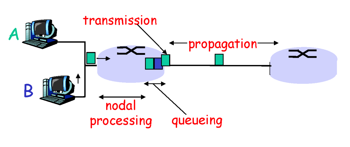 - 전파 지연(propagation delay) : 데이터가 실제 링크에서 이동하며 발생하는 지연이며, 링크의 길이를 빛의 속도로 나눈 것과 같다.